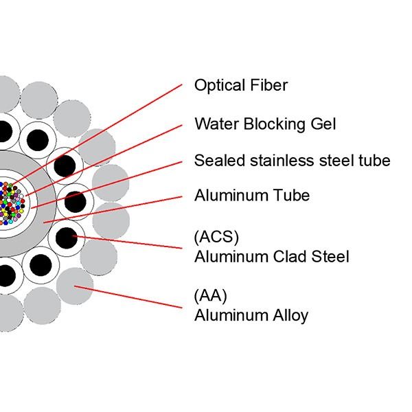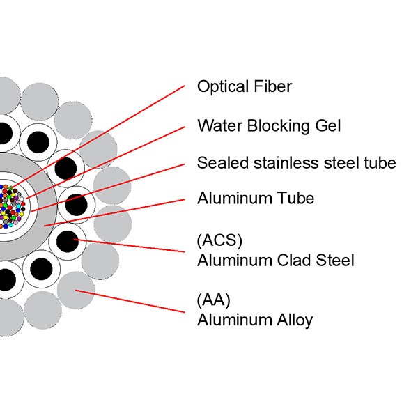 Lecâble de mise à la terre optique en filetsest constitué dedeux ou trois couches de fils en acier plaqué en aluminium (ACS), ou une combinaison d'ACS etfils en alliage d'aluminium, offrantrésistance mécanique, durabilité et performances électriquesLa conception standard présente untube central en acier inoxydable contenant les fibres optiques, recouvert d'aluminium pour une protection supplémentaire.